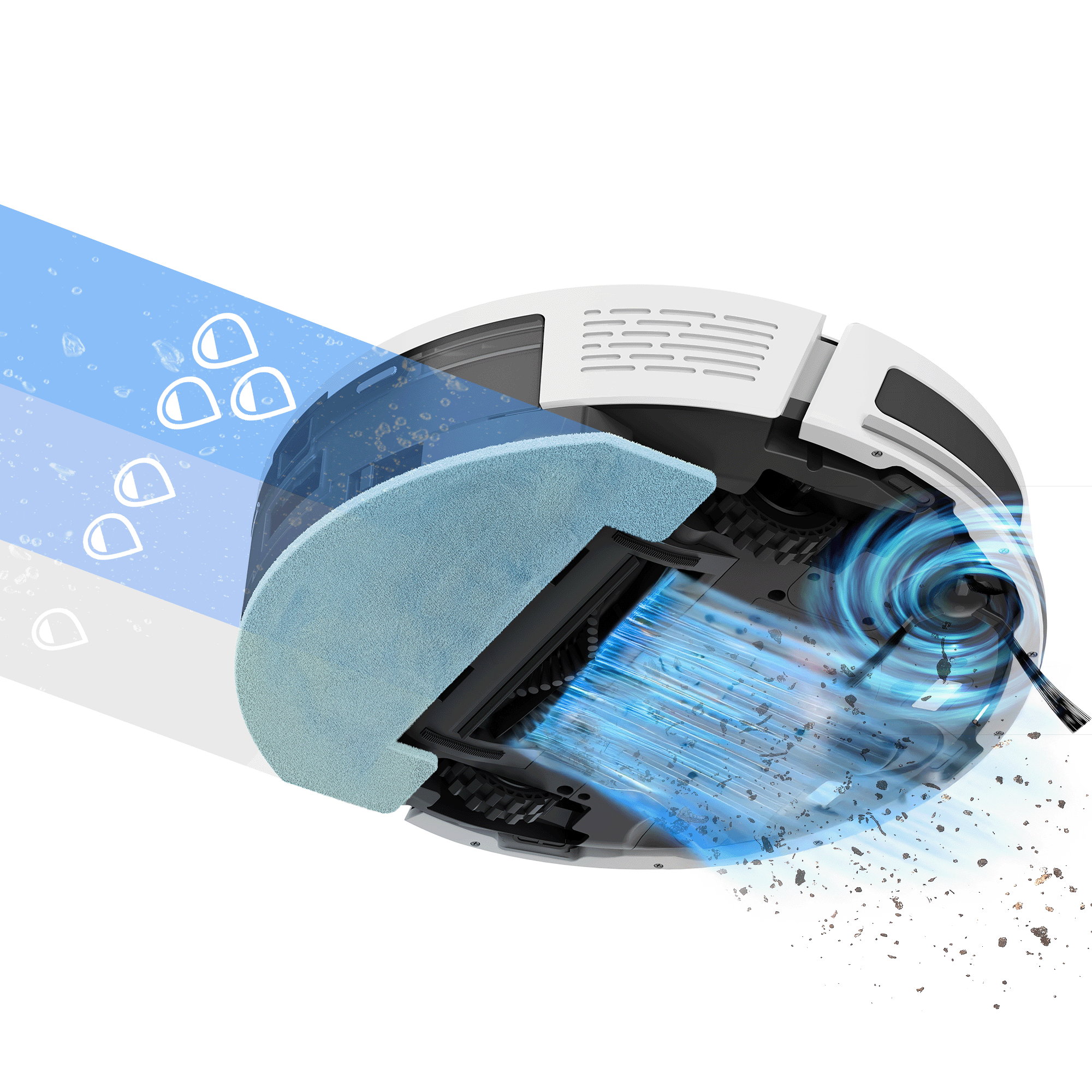 Robotický vysavač je vybaven elektronicky řízenou regulací průtoku vody pro optimalizované mokré stírání ve třech krocích, nízká, střední nebo vysoká intenzita pro velmi znečištěnou podlahu.
