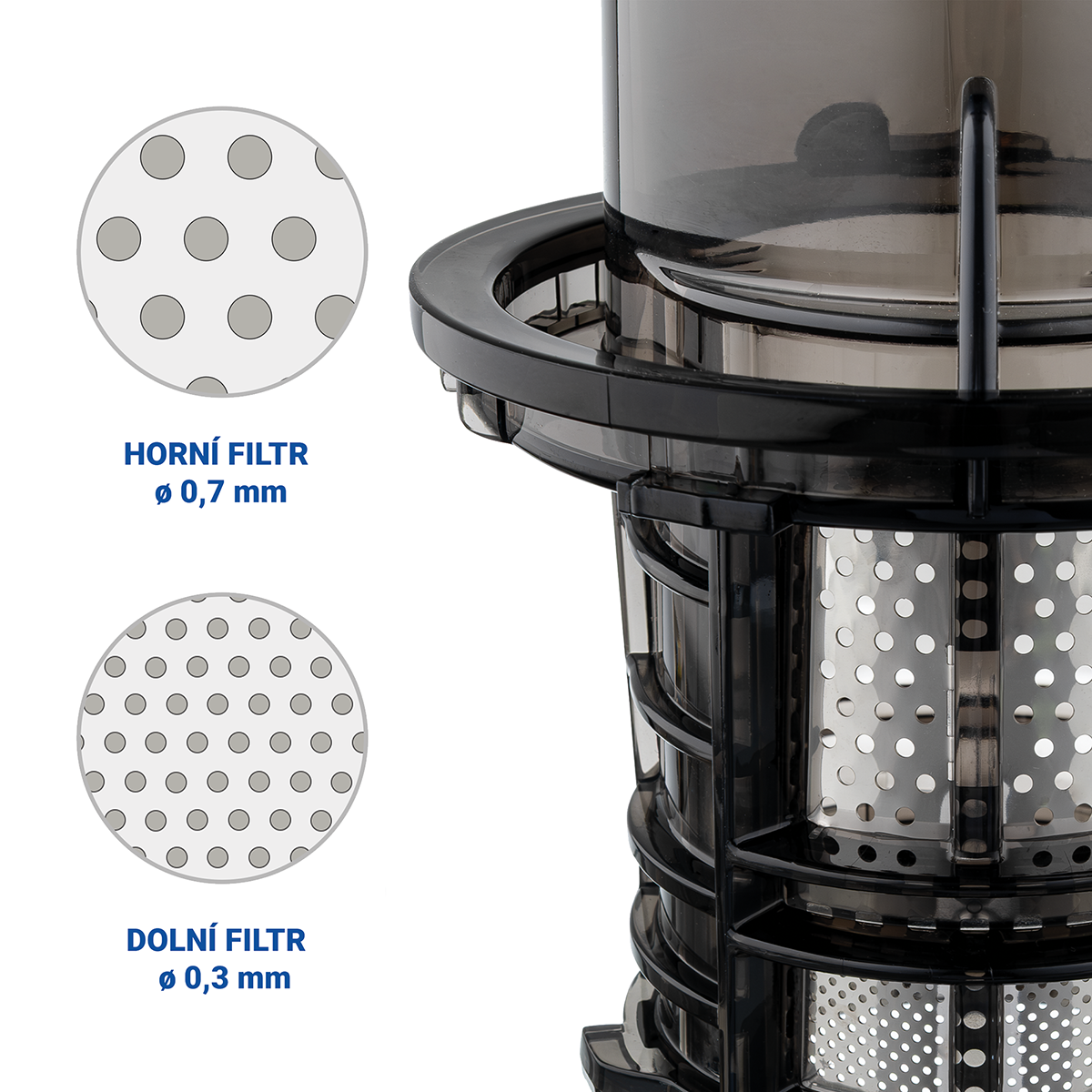 Zásobník na potraviny s jemným sítkem a Nádoba odšťavňovače jsou vyrobeny z materiálu TRITAN, neobsahuje bisfenol A (BPA), což je chemická látka, která může být škodlivá pro zdraví.