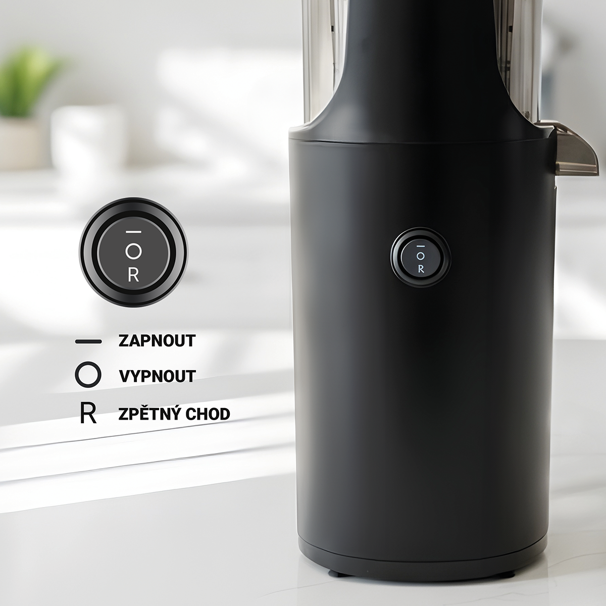 Odšťavňovač přestane fungovat, pokud otevřete horní víko během provozu. Díky gumovým nožičkám spotřebič bezpečně drží na pracovní desce a vy se nemusíte obávat o jeho stabilitu. Bezpečnost zajišťuje také zpětný chod, který minimalizuje riziko zablokování spotřebiče při práci.