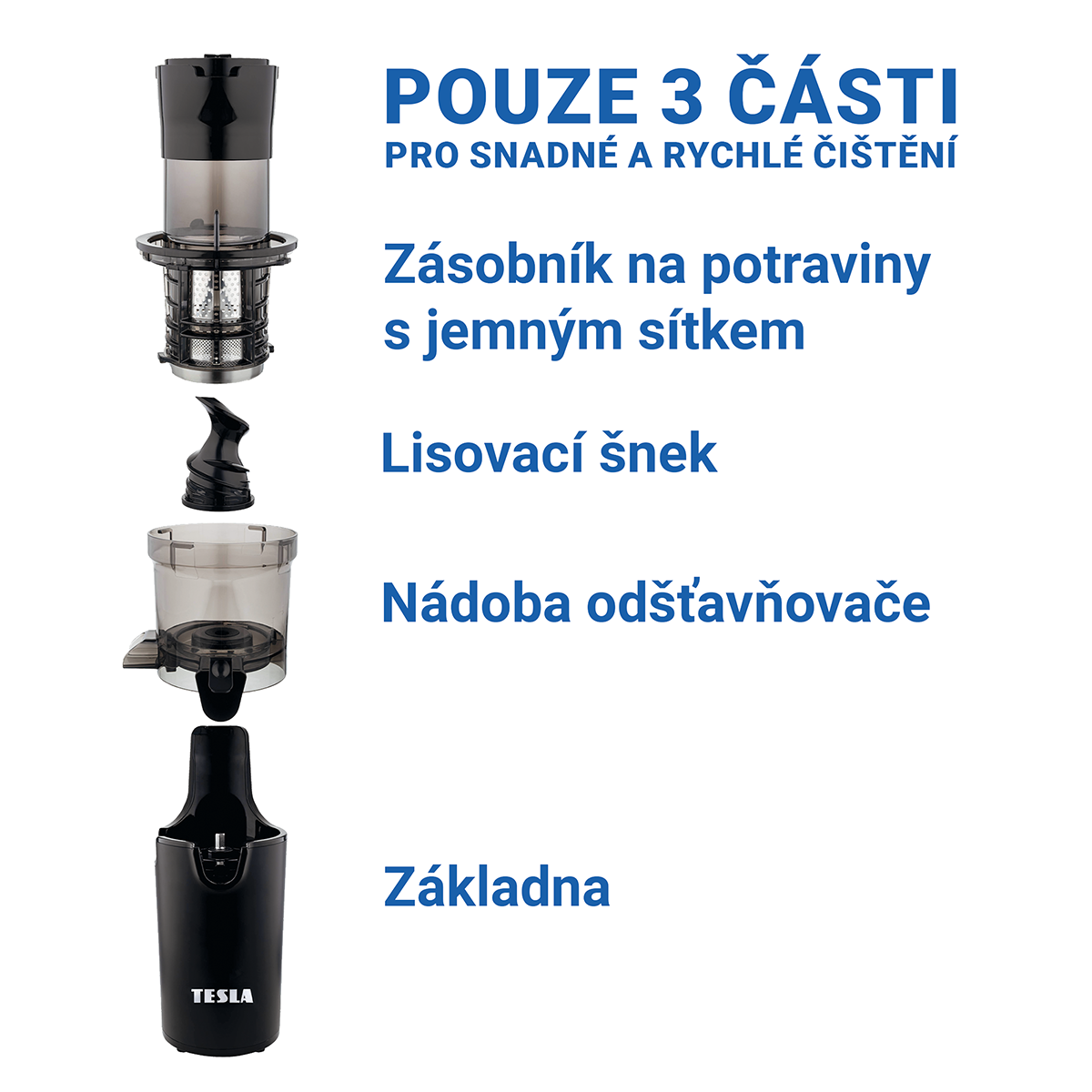 Konstrukce TESLA SlowJuicer SJ500 XL je velmi jednoduchá, skládá se pouze ze tří dílů k sestavení a čištění. Zásobník s integrovaným jemným filtrem vyčistíte během chvilky společně se šnekem a nádobou odšťavňovače. Věnujte více času odšťavňování a méně času čištění.